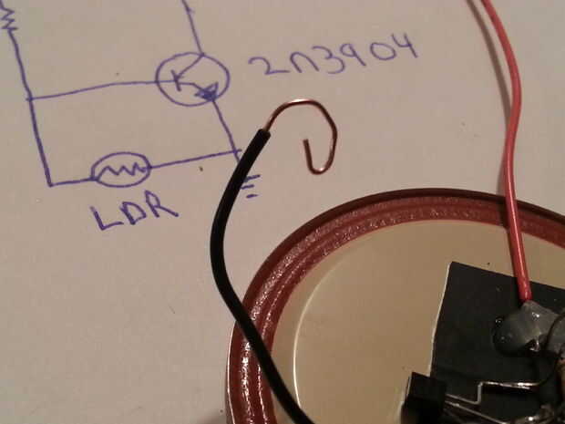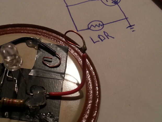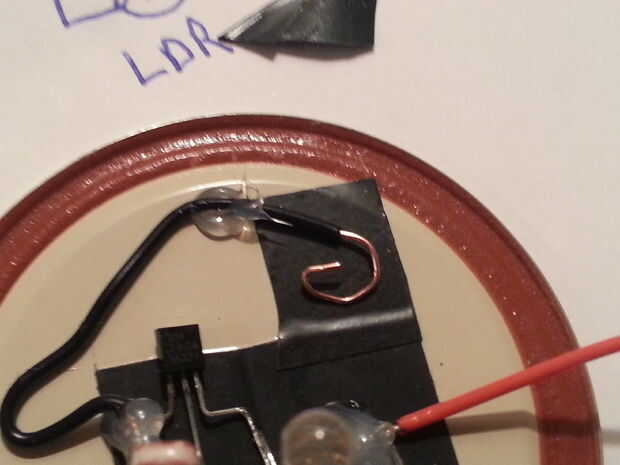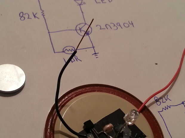 Tira de una pulgada o tan de aislante de cable negro primero Envuelva el cable alrededor de sus alicates para crear un bonito círculo o espiral. Esto ayuda a crear la superficie por el lado negativo de la batería. Luego pegamento caliente el alambre hacia abajo. (como se ve en la imagen)