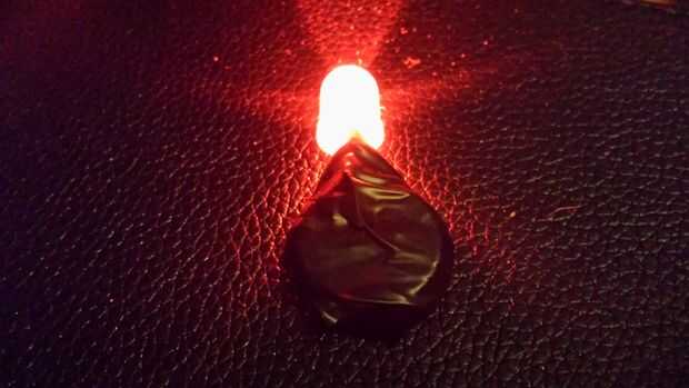 Simplemente deslice la batería entre los + - las patas del led. Una vez que se enciende y funciona todo seguro, utilice la cinta eléctrica para envolver completamente la batería. No necesitas un resistor para limitar la corriente para el led debido a la resistencia interna alta célula baterías. La iluminación puede durar días antes de un cambio de batería se requiere.