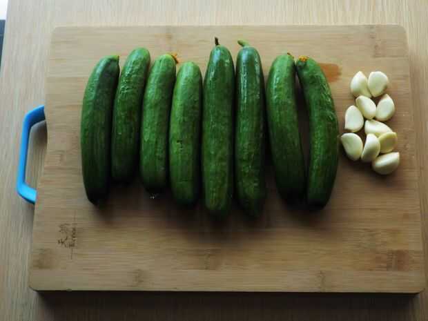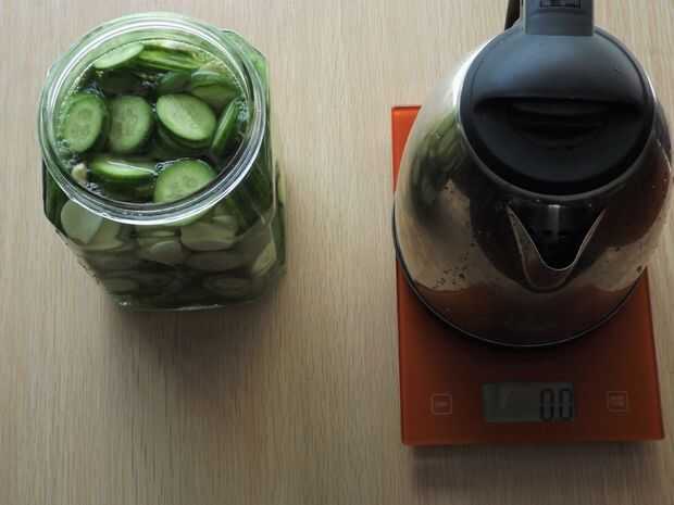 Ya que estamos trabajando con volumen, su envase determinará exactamente cuántos pepinos toma. En mi caso pude caber 8 pepinos medianos (rodajas de 1/8 o 4 mm) en mi envase junto con 10 dientes de ajo (a la mitad). Entonces, llené el depósito con agua hasta que apenas estaban cubiertas y les pesaron.