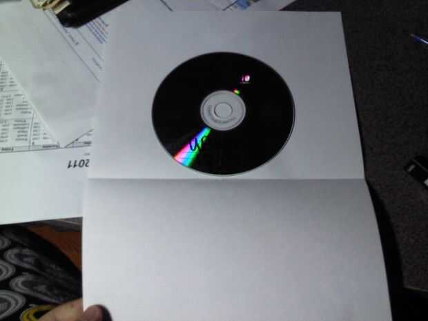 Lugar el cd en el papel para que sea unos 2" desde el borde superior del papel, intentar centro ancho sabio mejor forma posible. Manteniendo el borde del disco en el pliegue, tire de la parte inferior hasta sólo el labio superior del disco aparece, como se muestra en la figura 2. cinta.
