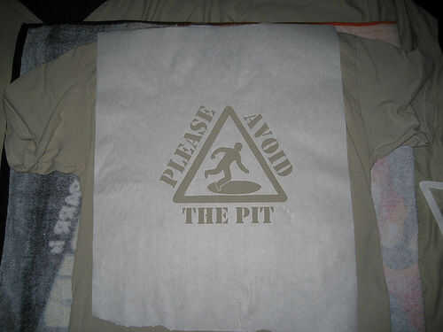 Empiecen planchando el papel de congelador abajo en el medio a alto con sin vapor. Trabajando desde el centro, reducirá el número de arrugas. y ayudarle a evitar la falta de áreas. Toda la hoja no tiene que planchar hacia abajo, pero haz los bordes y el área alrededor de la máscara bien pegada, o sus líneas será desordenadas.