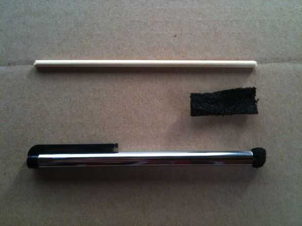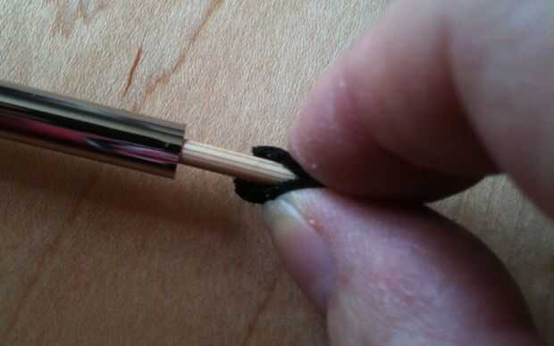 --Corte a longitud de la brocheta de woooden caber hasta en el extremo cerrado del tubo del metal, dejando sobre un extra 6mm (1/4 de pulgada) sobresale el extremo abierto. Alise el corte final a una forma redondeada, Roma que sobresalen. Un archivo de clavo funciona bien.