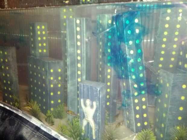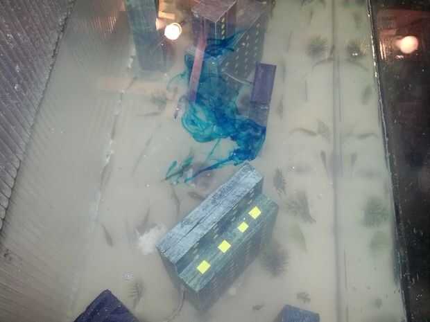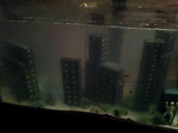 El agua remueve la arena bastante bien en el proceso de adición de 30 galones de agua, pero hay 25 peces y un puñado de LEDs dispuesto.