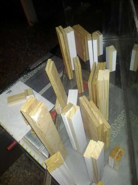 Protip: Tuvimos varias piezas de madera del mismo ancho, y después decidimos que íbamos a usar 2 piezas por edificio, ambos al mismo tiempo cortamos por lo que encajan perfectamente.