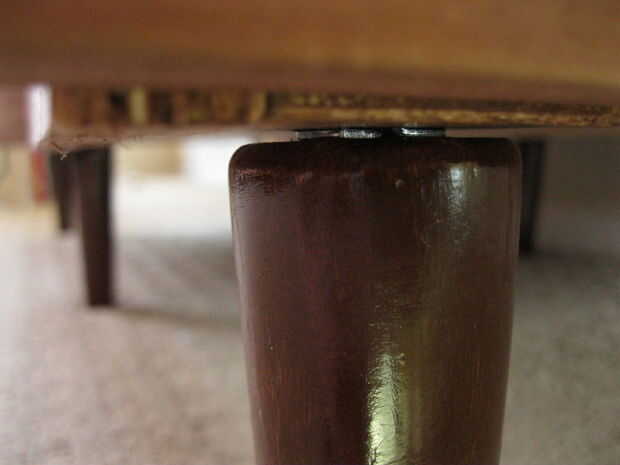 Los agujeros fueron perforados en los paneles de la parte inferior con las tuercas en T insertadas. Tornillo de la pata es alimentado a través de y apretado con una tuerca y arandelas.