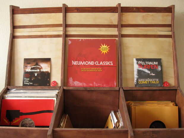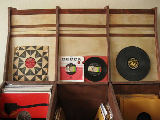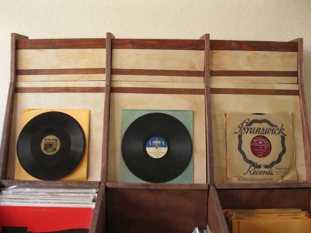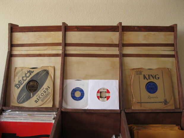 Cada bin es aproximadamente 14" de largo. Cada uno parece sostener cerca de 85 LPs y sus chaquetas cómodamente para un cargado total de 255, no incluyendo el reborde de la visualización espacial.