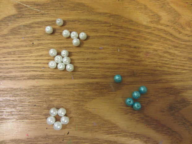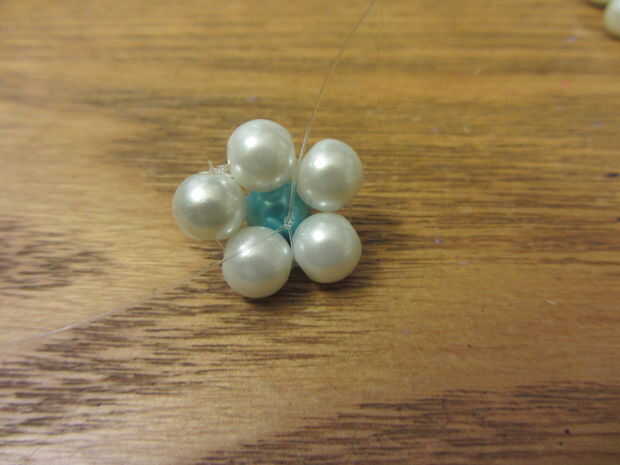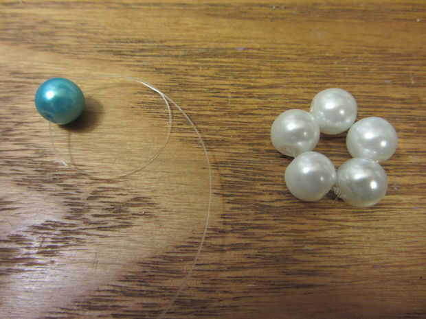 Cadena cinco perlas blancas en hilo de pescar y atar firmemente. Enrosque un teal perla en otro pedazo de hilo de pescar y hacer un solo nudo suelto, como el principio de atar los zapatos. Puesto en la parte superior del círculo de perlas blancas y doble lo nudo como se ve en la segunda a la última foto.