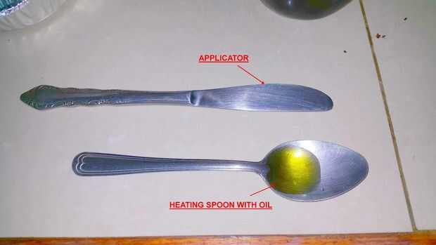 He usado una pequeña cantidad de aceite de oliva en una cuchara. Realmente puse demasiado en la cuchara, mucho menos se necesita en realidad. También se utiliza un aplicador en forma de un cuchillo de mantequilla.