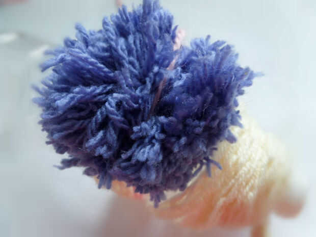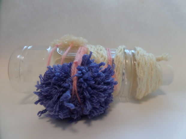 Atar tus pompones bajo-neath su lana/cuerda, si no sabes como hacer uno, Echale mi instructable sobre cómo hacer pompones! Meter el resto de la cadena de la lana (o cadena). Abra la tapa de la botella y añadir algunas delicias para el cat.