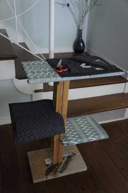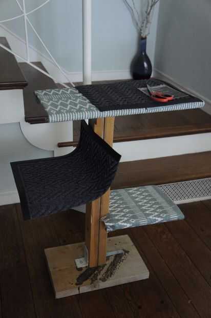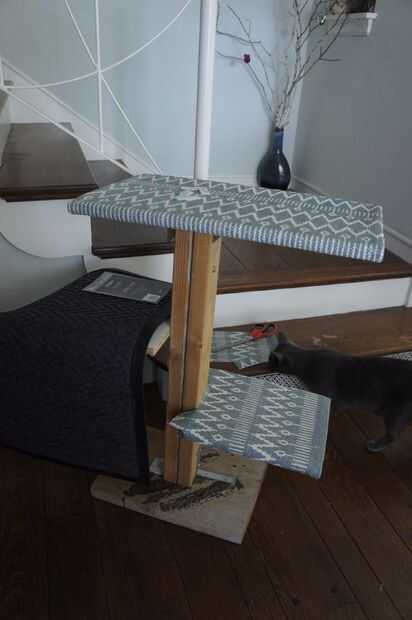 Para el segundo, más pequeño estante, terminé usando un martillo y clavos para asegurar el material de la alfombra. Descubrí que la parte posterior pegajosa que velcro no se adhiere bien a la alfombra del forro.