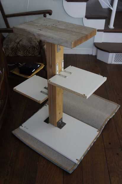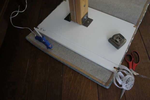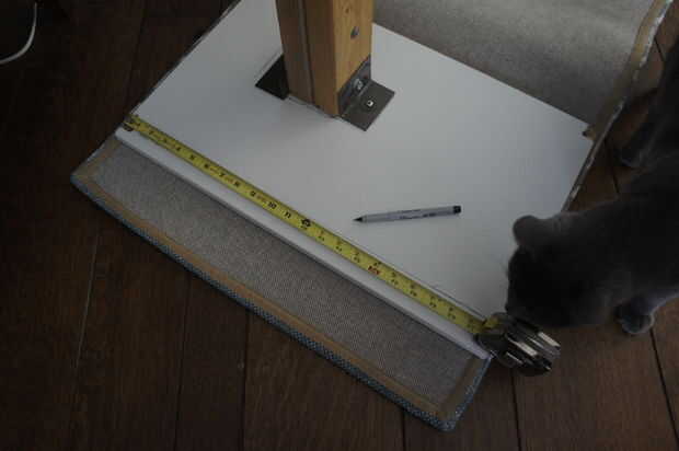 Voltee al rascador de gato y trazar una línea que indica la colocación de la cinta de velcro. Junte ambos lados de las tiras de velcro. Quitar el pegajoso detrás del lado que desee adherido a la plataforma y coloque sobre la línea, alisando hacia fuera como lo haces. Cortar al final.