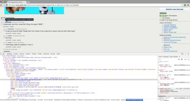 Vemos que los nombres de usuario en un hilo de reddit se relacionan con vínculos con la clase "autor". Ahora aquí está la parte difícil: necesitamos alguna manera de ordenar a través de todos los elementos de la página web diferente para pasar a la etiqueta con la clase "autor". Como se puede ver no es un viaje fácil porque estos enlaces se encuentran el:
