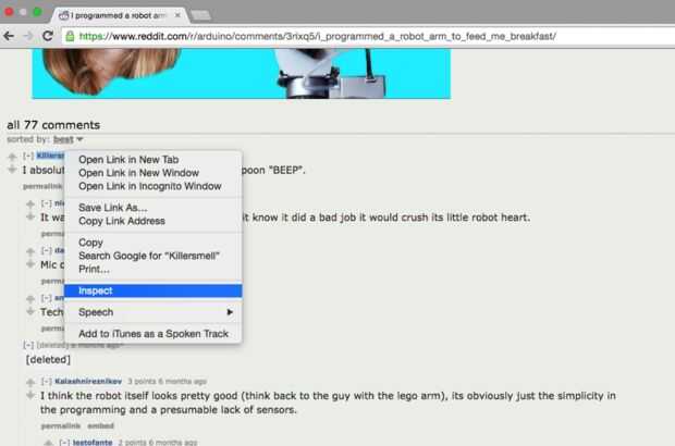 la identificación de lo que nuestra información está etiquetado bajo. En este caso, queremos que todos los nombres de usuario en los comentarios de un hilo de reddit. Así que vamos a utilizar google chrome Inspeccione la herramienta elemento para averiguar lo que el nombre de usuario está etiquetado como. (imagen 1)
