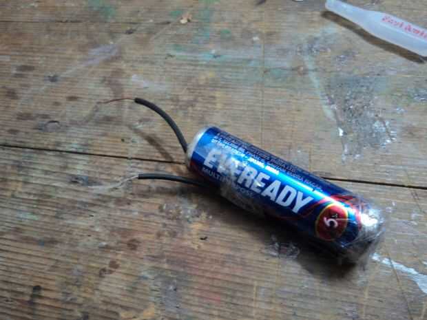 Cinta a dos cables de los dos terminales de la célula de AA de 1.5 voltios. No utilizar celulares voluminosos (mayor tamaño) este celular es para que el pequeño motor ejecutar.