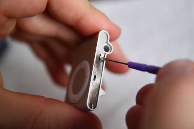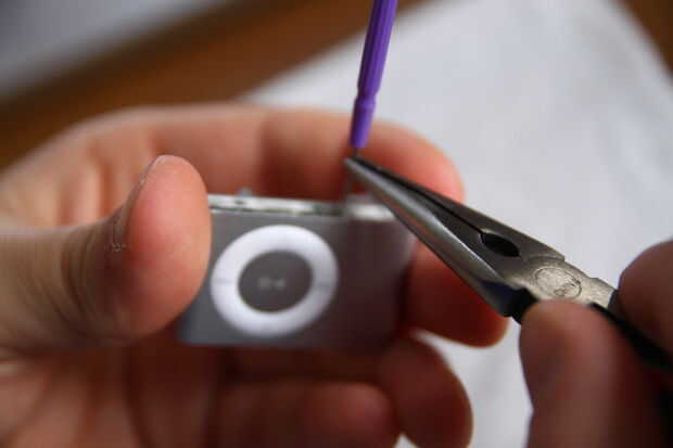 Luego con cuidado retirar las cubiertas de metal a ambos lados de la iShuffle. Si las cubiertas de metal no caen entonces eliminarlos...