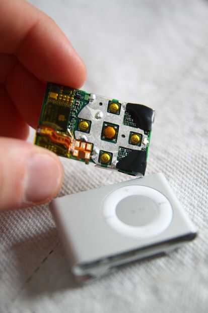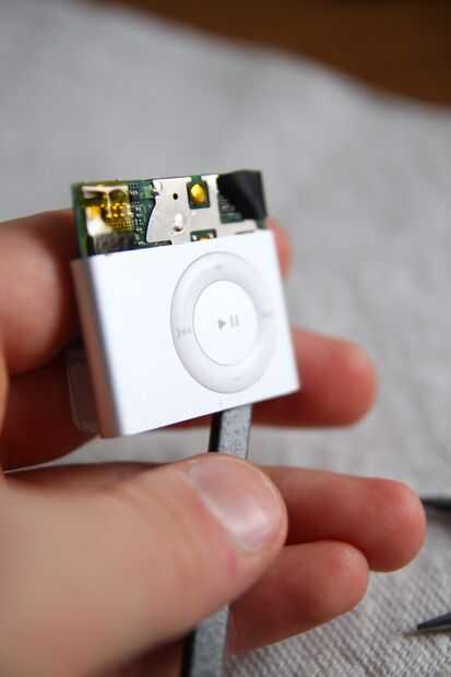 Retire la placa de circuito de iShuffle el caso cuidadosamente. Utilizado mi spudger pulsando en el corchete del metal en la parte inferior de la iShuffle para sacarlo de la caja. Sorprendentemente mucho de la fuerza era necesario para obtener la placa de circuito de la caja. Se ha pegado o muy encajada en el caso...