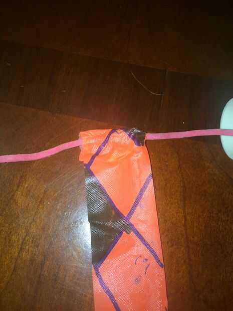 Para el cohete que vamos a construir nosotros usando un streamer naranja 4 pulgadas. De esta forma el cohete bajará un poco más lento y el cono de nariz no pegan 5 pulgadas en el suelo. Para colocar el streamer primero hay que conectar el cable de descarga. Hacer este corte el caucho de la banda por la mitad y doble un pedazo de papel sobre un extremo de ella (Foto #1). Pegar esta pieza de papel de aproximadamente 2 pulgadas en el interior del cono de nariz (pic #2). Luego atar el otro lado en el cono de nariz. ¿Ningún cono de la nariz? Enrollar el papel de la impresora en un ángulo (ver foto #4) lo suficiente como para poner sobre el fuselaje de cohetes y cortar el exceso. Luego tome otro recorte de papel y doblar y pegar el otro extremo en el interior del cono de nariz. Después de haber hecho esto, asumir un extremo de la serpentina y el pliegue de la goma elástica y cinta junto (Foto #3). Ahí lo tienen. Un sistema de recuperación agradable y cono de nariz!