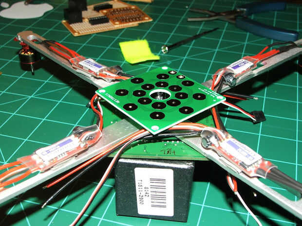 Terminé de montar los motores hacia arriba y girar el tablero de distribución en más de una configuración de X. Seguí la construcción y había pegado (ca) cuatro condensadores de una placa base del ordenador la tarjeta de red. Luego pegué el tablero de distribución en la parte superior de los condensadores con una placa de circuito en blanco en cuatro condensadores más. Apliqué un trozo de cinta de doble cara a la placa de circuito para mantener bajo el protector de espuma que la KK2 (controlador de vuelo) fue enviado en y añadido un contenedor plástico cinta aislante a la parte inferior de la batería. Cinco cables servo de 1" y los de la KK2 a una Junta de receptor Turnigy 9x8cv2. Utilizan dos capacitores más y pegado a la Junta de espuma y receptor con suficiente espacio para acceso a los botones de programación KK2. Terminado mediante la conexión de los cables de señal de la esc a la KK2 comenzar con 1,2,3,4. Tenga en cuenta que son de 1,3 cw y 2, 4 izq.