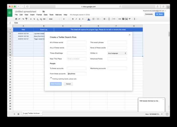 Nota sobre los resultados de una búsqueda: el API de Twitter no proporciona todos los tweets históricos mediante la API. Sólo devolverá tweets que han sido escritos en los últimos 5-7 días o 1000 últimos tweets. El archivador sin embargo será buscar tweets futuro para cualquier término que está siguiendo. La edición gratuita de la Twitter Archiver permite controlar hasta 2 consultas de búsqueda. La edición gratuita encuestas Twitter cada hora mientras que la edición premium tira tweets cada 15 minutos por lo que es más conveniente para el seguimiento de términos que están generando gran cantidad de tweets (como una conferencia #hashtag o un evento de deportes en vivo).