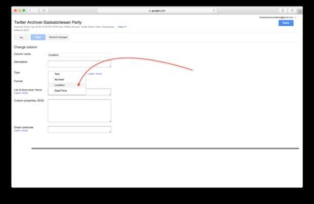 2) junto a "Tipo" se verá que "Texto" puede ser elegido por defecto. Haga clic en "Texto" y cambiar el tipo "Ubicación". Golpe "Guardar".