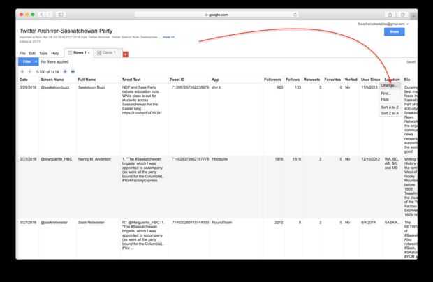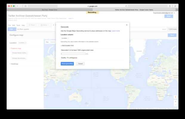 4) tablas de Fusion Google inmediatamente comenzará geocodificación las ubicaciones de la hoja de cálculo y producirá un mapa con todos los puntos de la columna "Ubicación". Esto tomará algún tiempo. Observe la sección que dice calidad: siempre obtendrá resultados ambiguos porque Twitter permite a los usuarios entrar en lo que quieran en la ubicación en su perfil.