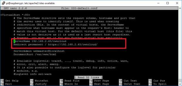 Editar la línea de nombre de servidor quitando el # y poner tu IP local o nombre de dominio si tiene uno. También agregamos una línea que redireccionará todo el tráfico a la versión HTTPS. Estas son las líneas para añadir/editar