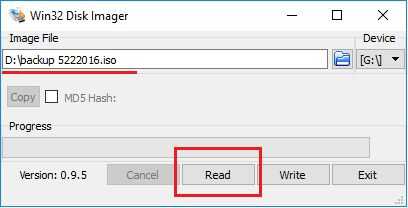 abrir Win32diskimager y escriba la ruta de acceso y el nombre del archivo seguido de .iso