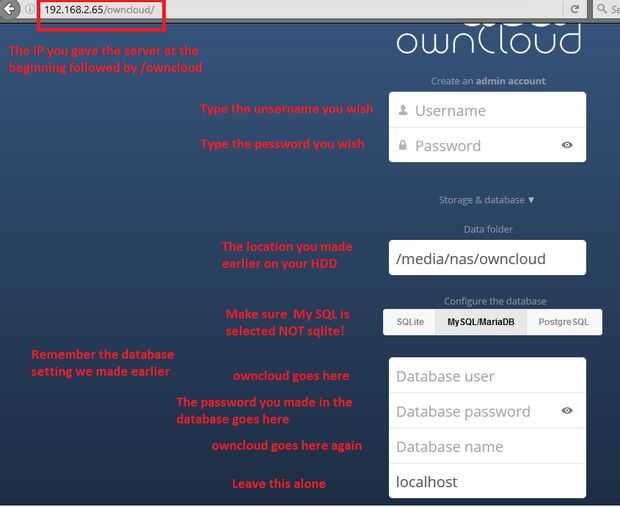 Prácticamente su crear su cuenta de admin, tipo el directorio formuló cuando hicimos las carpetas y montado el disco duro entonces utilizar MySQL y sqlite no. Luego ingrese la información que hemos creado en la base de datos MySQL anterior.