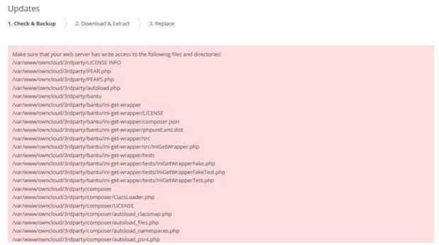 Ahora si Desplácese hacia abajo y haga clic en update, después de unos pocos, usted verá una caja larga de errores pop-up. Esto significa owncloud no tiene permiso para cambiar el contenido de esa carpeta, permite arreglar eso. Según el manual de administración de owncloud proporcionan. Tan pronto como pueda después de la instalación y proporcionan un pequeño script, debe establecer permisos de carpeta. Puesto que hemos utilizado la ruta de instalación predeterminada para owncloud, esto es no donde archivo se almacenan cargas, simplemente podemos copiar y pegar allí el código y lo configuró todo para nosotros.
