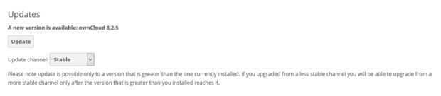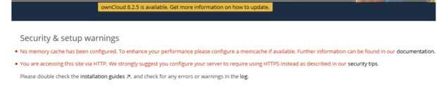 Ahora que ya tenemos establecido owncloud y trabajando, verá una notificación diciendo que hay una actualización disponible. Si haces clic en el nombre de usuario en la esquina superior derecha, puede seleccionar administrador. Esto abrirá una página para cambiar la configuración, ahora te darás cuenta que tengo algunos errores junto con una actualización.