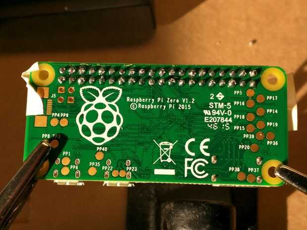 Una vez que tienes el lado "más corto" de los pasadores insertan en la parte superior de la pi cero - utilizar alguna cinta aislante para sujetar los pasadores en su lugar. (Debe estar al ras con la placa cuando se graba hacia abajo)