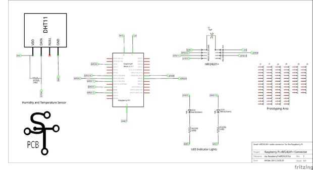 Usé Fritzing para bosquejar hacia fuera de un esquema muy simple. El sensor DHT11 fue una idea tardía, una idea de un prototipo anterior, pero que son bastante baratos y siempre hay espacio para un sensor o dos. De hecho el DHT22 caben en el mismo lugar, sin ninguna modificación en el hardware.