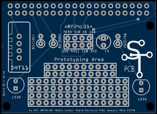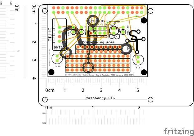 Para mi tercer prototipo usé un tablero de prototipo de 60 x 40 mm y corte hasta 55 mm x 40 mm con una Dremmel herramienta. He encontrado esto caber encima de la Raspberry Pi y también sentarse dentro de la caja (la tapa). Esto me impulsó a completar el diseño y orden de un PCB personalizado. He utilizado el proveedor habitual ($13 para 10 tarjetas, con envío en $28, de esta manera que las tablas terminan costando unos $4). Los archivos Gerber son incluidos en esta sección para descargar.
