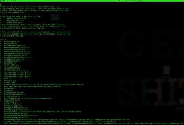 # This is the ssh client system-wide configuration file. See # ssh_config(5) for more information. This file provides defaults for # users, and the values can be changed in per-user configuration files # or on the command line. # Configuration data is parsed as follows: # 1. command line options # 2. user-specific file # 3. system-wide file # Any configuration value is only changed the first time it is set. # Thus, host-specific definitions should be at the beginning of the # configuration file, and defaults at the end. # Site-specific key exchange algorithms. This is here so that if you're # having trouble logging into a server, you can modify and uncomment the # lines below and be on the way to getting work done. # Host github.com *.github.com # KexAlgorithms curve25519-sha256 # Site-wide defaults for some commonly used options. For a comprehensive # list of available options, their meanings and defaults, please see the # ssh_config(5) man page. Host * # ForwardAgent no # ForwardX11 no # ForwardX11Trusted yes # RhostsRSAAuthentication no # RSAAuthentication yes # HostbasedAuthentication no # GSSAPIAuthentication no # GSSAPIDelegateCredentials no # GSSAPIKeyExchange no # GSSAPITrustDNS no # BatchMode no # CheckHostIP yes # AddressFamily any # ConnectTimeout 0 # StrictHostKeyChecking ask # IdentityFile ~/.ssh/identity # IdentityFile ~/.ssh/id_rsa # IdentityFile ~/.ssh/id_dsa # Port 22 # Protocol 2,1 # Cipher 3des # Ciphers aes128-ctr,aes192-ctr,aes256-ctr,arcfour256,arcfour128,aes128-cbc,3des-cbc # MACs hmac-md5,hmac-sha1,umac-64 # EscapeChar ~ # Tunnel no # TunnelDevice any:any # PermitLocalCommand no # VisualHostKey no # ProxyCommand ssh -q -W %h:%p gateway.example.com # RekeyLimit 1G 1h UseRoaming no SendEnv LANG LC_* HashKnownHosts yes GSSAPIAuthentication yes GSSAPIDelegateCredentials no KexAlgorithms curve25519-sha256 PasswordAuthentication no ChallengeResponseAuthentication no PubkeyAuthentication yes HostKeyAlgorithms ssh-ed25519-cert-v01 Ciphers chacha20-poly1305 MACs hmac-sha2-512-etm