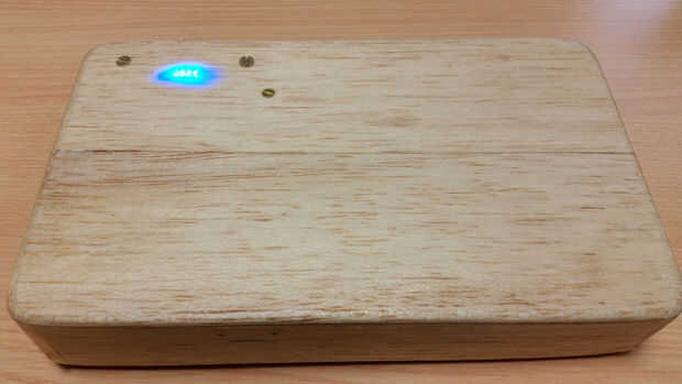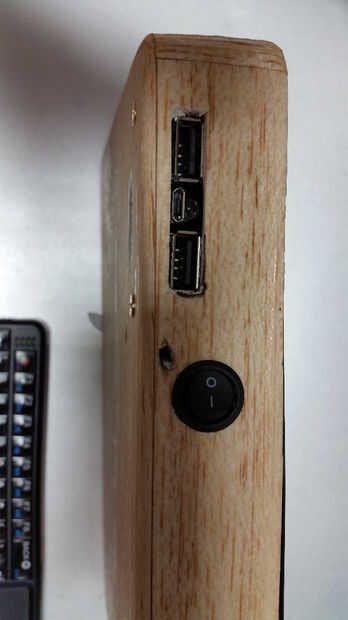 Aunque no es muy acabado aún, todavía necesita un nuevo caso (un poco más cuidado sobre la madera) una gota de sugru en la película interruptor de alambre y algunas aberturas de USB mejor diseñadas. Creo que podría hacer una tapa para el orificio usb o algo.