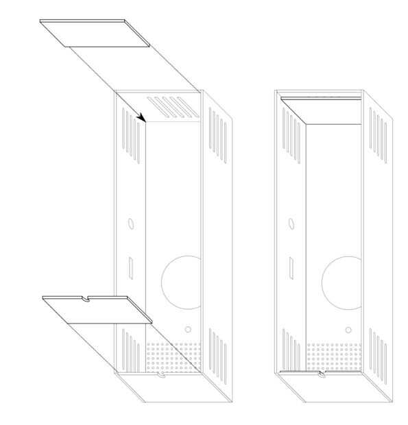 Primero, pegue las dos piezas rectangulares pequeñas en la parte superior y la cara inferior, dentro de la caja. Estas se utilizarán para llevar el interior marco del canal de deslizamiento.