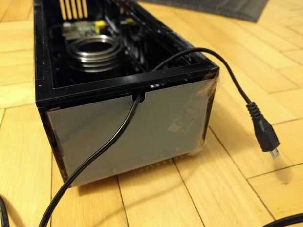 Poner la parte interior del marco (el más pequeño de los marcos del dos rectángulo) dentro de la caja en la parte superior los dos portadores que pegan en el paso anterior. ¡ PERO! Antes de hacerlo, te darás cuenta que la cara inferior tiene un pequeño semicírculo de apertura que se utiliza para dejar el poder a través de la cuerda, así que coloque el cable de alimentación a través de la abertura antes de pegar el interior marco. (O puede dividir el interior marco en la parte inferior. La única razón por qué no pre corte es que si se cortó, el marco entero puede deformar un poco durante el proceso de corte láser).