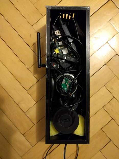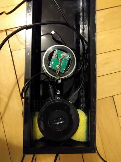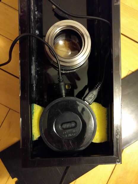 Utilicé una esponja para lavar platos para mantener el altavoz bluetooth en lugar de la parte inferior, la lente se ajuste apretado en la apertura, y no necesita ningún apoyo y la PI de frambuesa y los cables... bueno... son un desastre, con o sin compartimientos :)