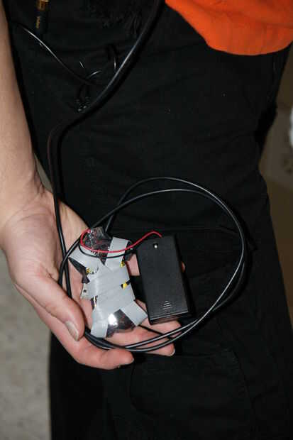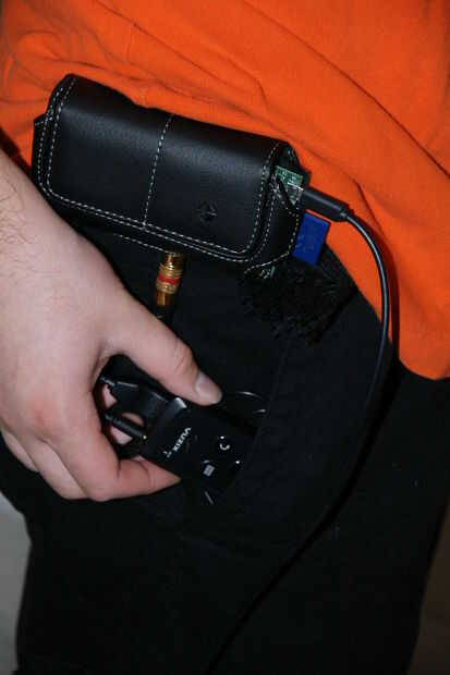 Esto es bastante simple, pero varía en función de los pantalones que llevas.  Tengo un caso de teléfono celular que en mi cinta, así que lo primero que hago es ponerlo en mi cinturón.  Luego, poner la batería en el bolsillo y conecte el cable microUSB al Pi.  Los bits extras del cable microUSB se pueden empujar en el bolsillo.  Puse la caja de control de video gafas en un bolsillo separado ya que tengo dos (estoy usando pantalones de carga).