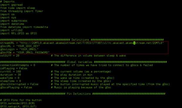 gDocURL = "YOUR_GDOC_KEY" gDocLogin = "YOUR_GMAIL" gDocPSW = "YOUR_GMAIL_PASSWORD"