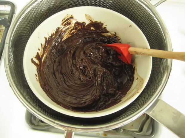 Colocar el vaso en el agua hirviendo y mezcla hasta que el chocolate se funda totalmente y es líquido.
