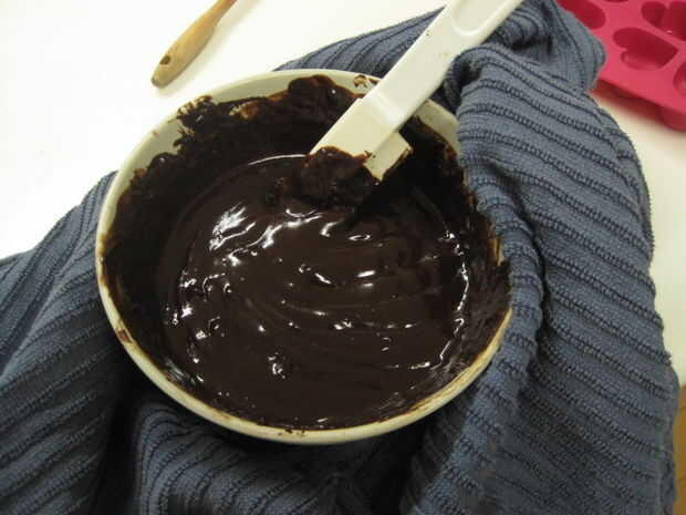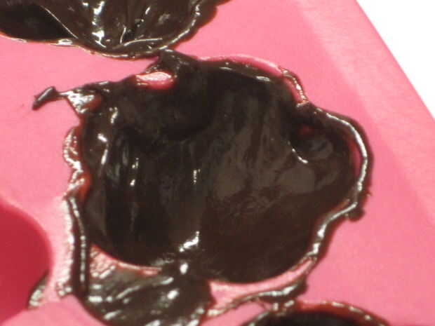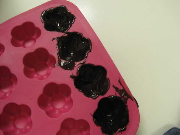 Ahora que todos nuestros chocolates es líquido, podemos aplicar una pequeña capa de la misma a las paredes del molde como en las fotos. Esto creará un espacio para poner nuestro coulis.