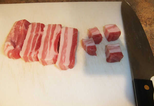 Paso 5: Cortar la carne de cerdo salada - hice cubos de 1 pulgada, pero un poco más grande o un poco más pequeño está muy bien. Apartarlas cuando listo.