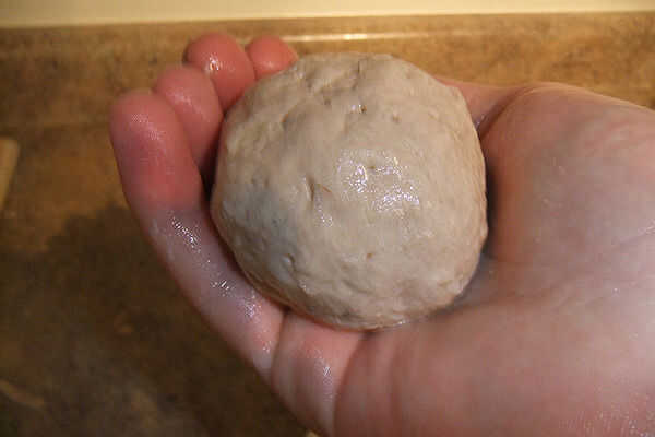 Paso 6: Formar la raspekaker -primero Mójese las manos, agarrar una cantidad del tamaño de una pelota del tenis de la mezcla de patata y formar una bola. Luego coge uno de sus cubos de cerdo sal y empuje en el centro de la bola. La superficie de la bola, ocultando la carne dentro de la reforma. Apartar la bola en un plato y seguir de forma raspekaker hasta que has usado toda la mezcla. Es recomendable limpiar las manos después de formar cada pelota como la mezcla pegajosa puede acumular haciendo el proceso más difícil que tiene que ser.
