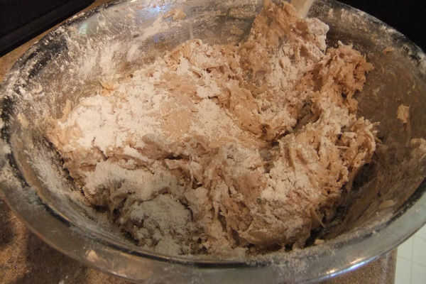 Paso 4: Añadir la harina y mezclar sobre - revuelo en un 1/4 de taza cada vez, hasta llegar a una consistencia de masa húmeda (o hasta que el brazo se cae, lo que ocurra primero). La idea es empaparse de algunos del agua de las patatas y espesar la mezcla, pero no tanto que se convierte en seca o quebradiza. Unas patatas son más acuosas que otros por lo que la cantidad de harina necesaria variará. Usé apenas tímido de dos tazas de este lote. Después de que has logrado la consistencia deseada, o algo muy cercano (cree me no es un proceso de precisión), se puede fijar a un lado.