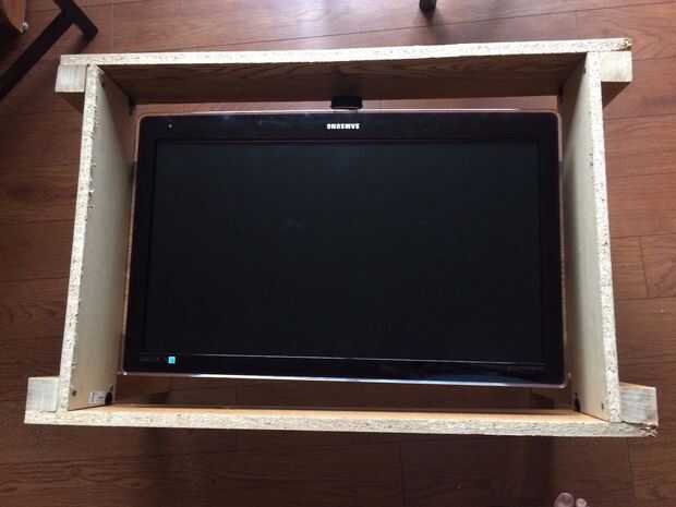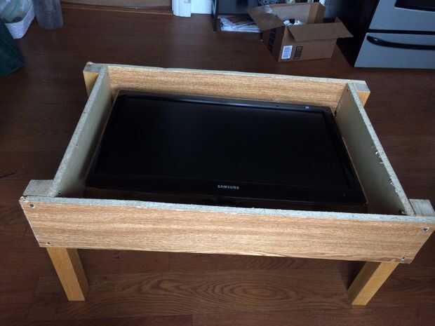 Construí una tabla sencilla de algunos "madera" de los muebles IKEA que estaba a punto de lanzar. Cortar las piernas de una vieja mesa y el delantal/lados de una librería de viejo. Siguiendo libremente el wikiHow "Construir una mesa de café", he podido construir una base y un marco alrededor del monitor LCD usando el trozo de madera IKEA. Sólo asegúrese de que la mesa es lo suficientemente grande como para caber al monitor (el mío es 27").