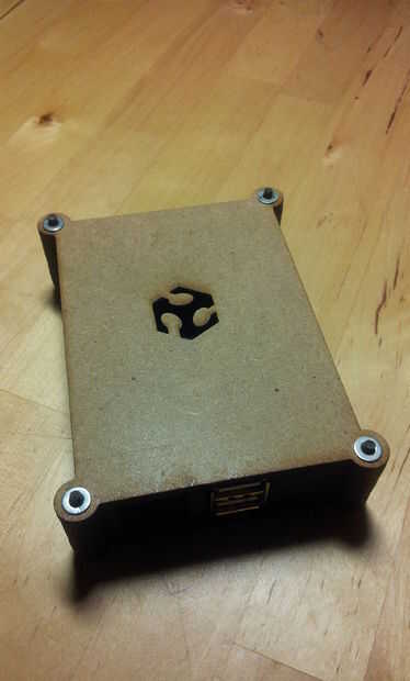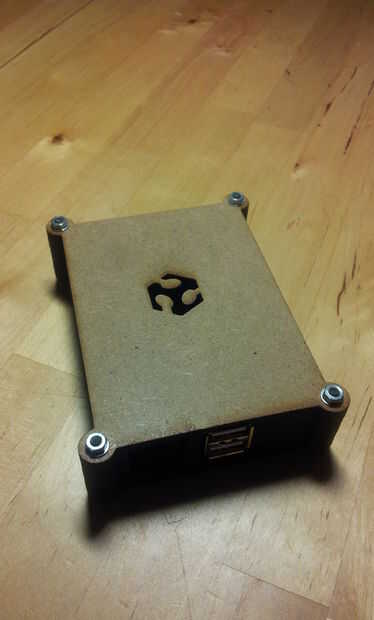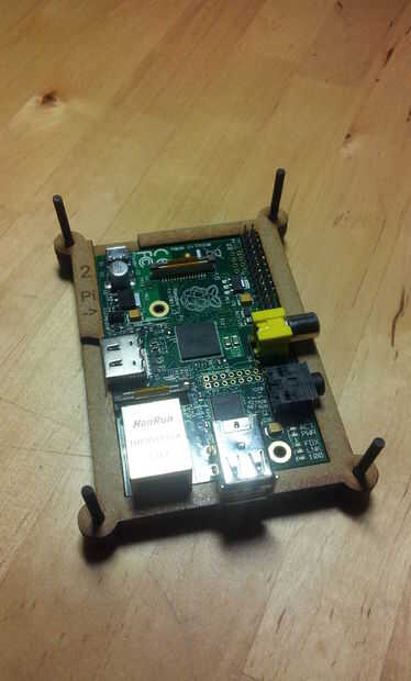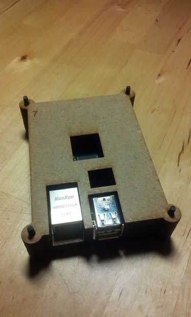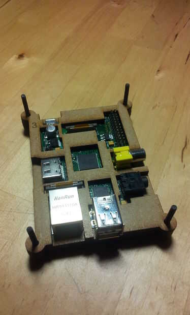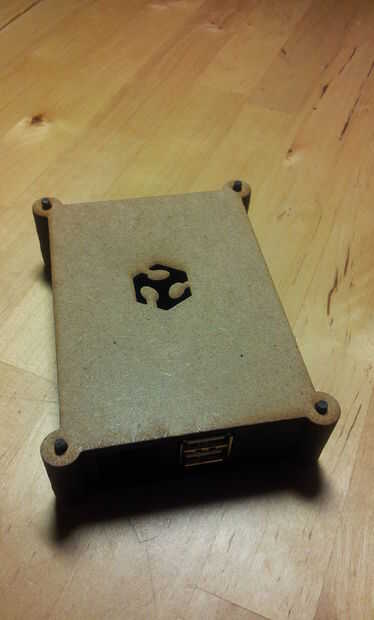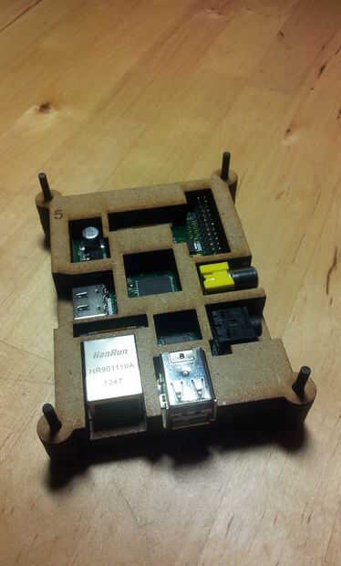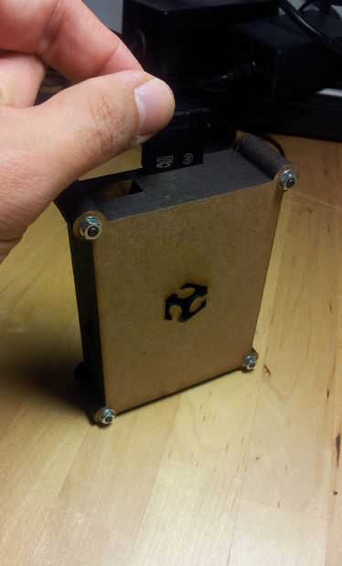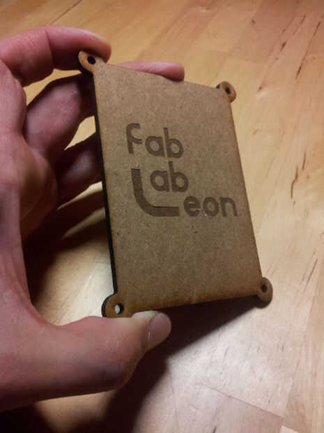 El montaje se realizará desde la base (la plancha con el texto Fab Lab León) y después la tiene el numero 1 luego el 2, después introduciremos la frambuesa Pi encima de la plancha 2 (pecado la SD), luego la 3, luego la 4... hasta terminar con la plancha tiene el logo permiso de Fab Lab.