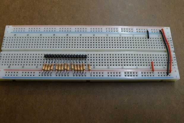 5. insertar una fila de 15 cabeceras masculinas más abajo en el protoboard.