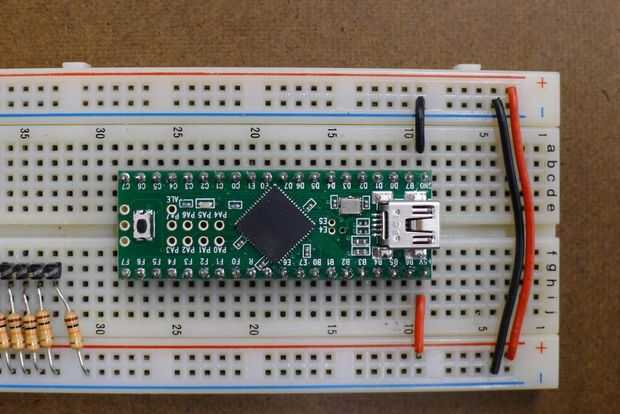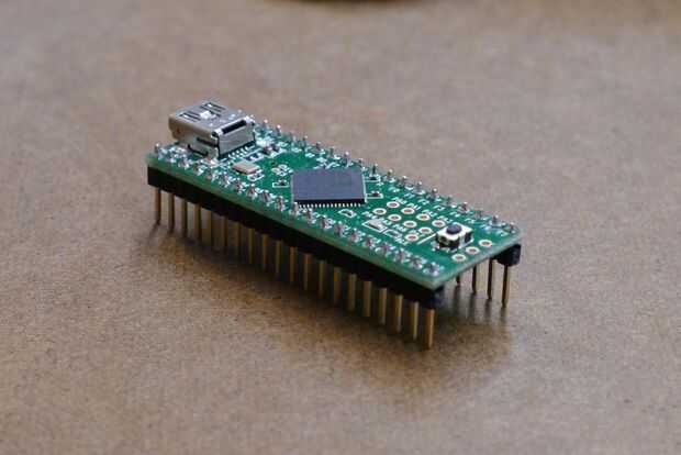 4. Inserte el Teensy, alinear la energía y tierra pins con los cables que colocas en el protoboard.