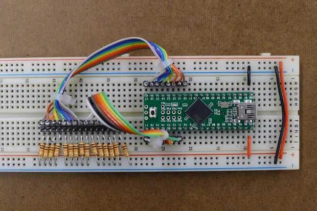 8. Conecte las líneas de encabezado masculino primero 8 (contando desde la izquierda) a la Teensy: